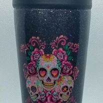 Spice up your drink game with our 16 oz Glitter Skull Trio tumbler! Crafted from durable stainless steel and coated in resin, this tumbler will keep your drinks insulated and looking fab. Plus, the trio of candy skulls against the sparkly black backdrop adds a touch of playfulness to your sips.